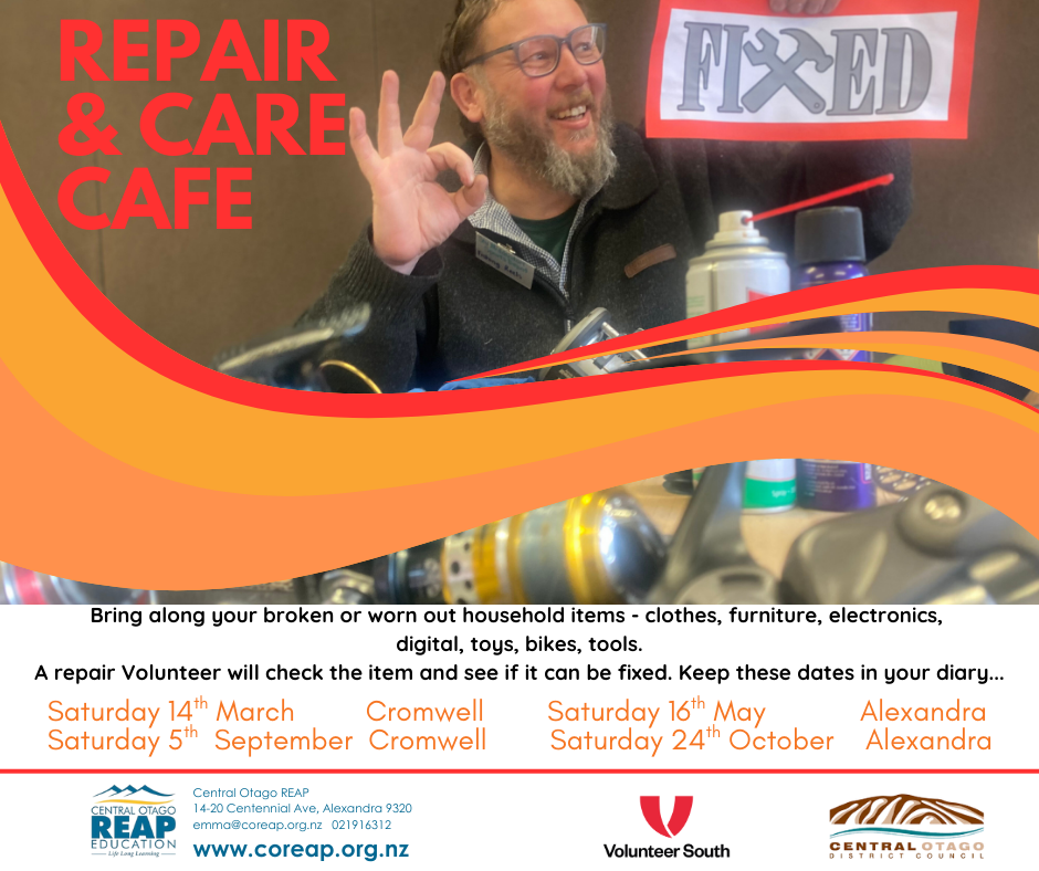 This year we’re rolling out four Repair & Care Cafés across Central Otago, kicking off in Cromwell.