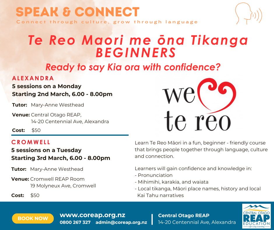 Join our 5-week course beginning in Cromwell on Tuesday 3rd March, and connect with language, culture, and your community!