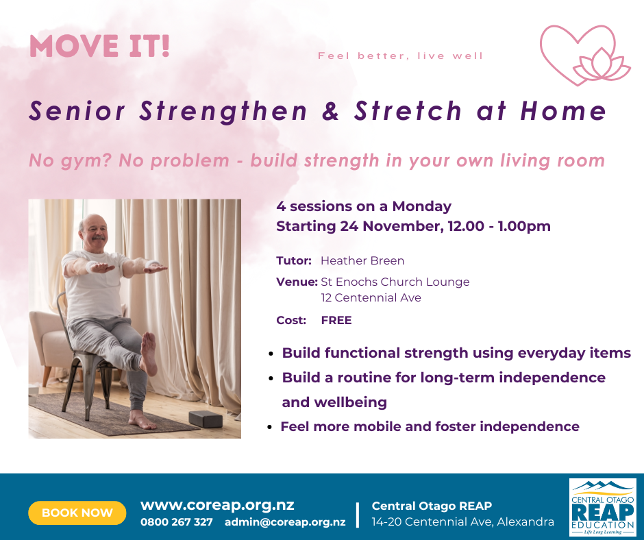 Learn simple, effective exercises using everyday household items — no special equipment needed. Build functional strength, improve balance and flexibility, and create a routine that supports long-term independence and wellbeing.