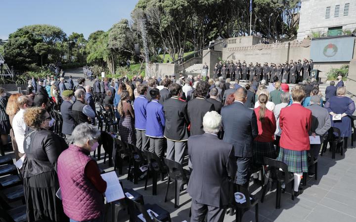 People stand during the National Commemoration Service at Pukeahu National War Memorial in Wellington. Photo: RNZ / Angus Dreaver