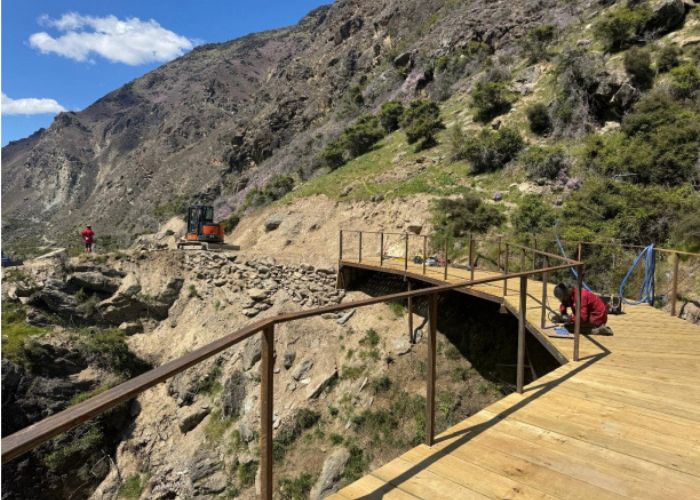 Contractors finish the deck of a bluff bridge on the Kawarau Gorge Trail. Image: Supplied/Dave Howard