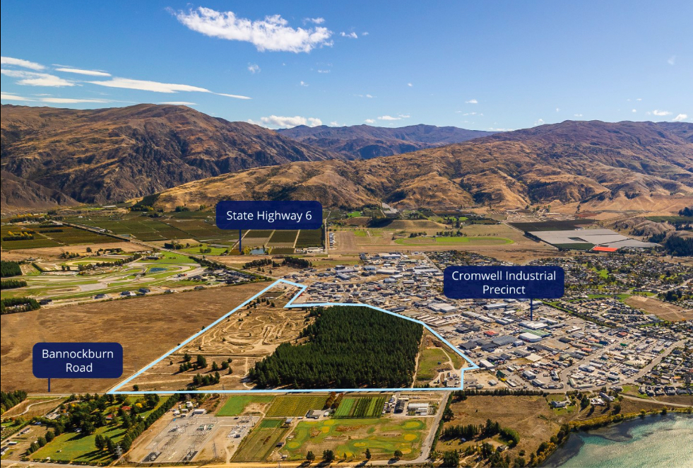 Fifty-two hectares of council-owned land along Bannockburn Road rezoned for industrial development is on the market. Image: Facebook/Colliers New Zealand