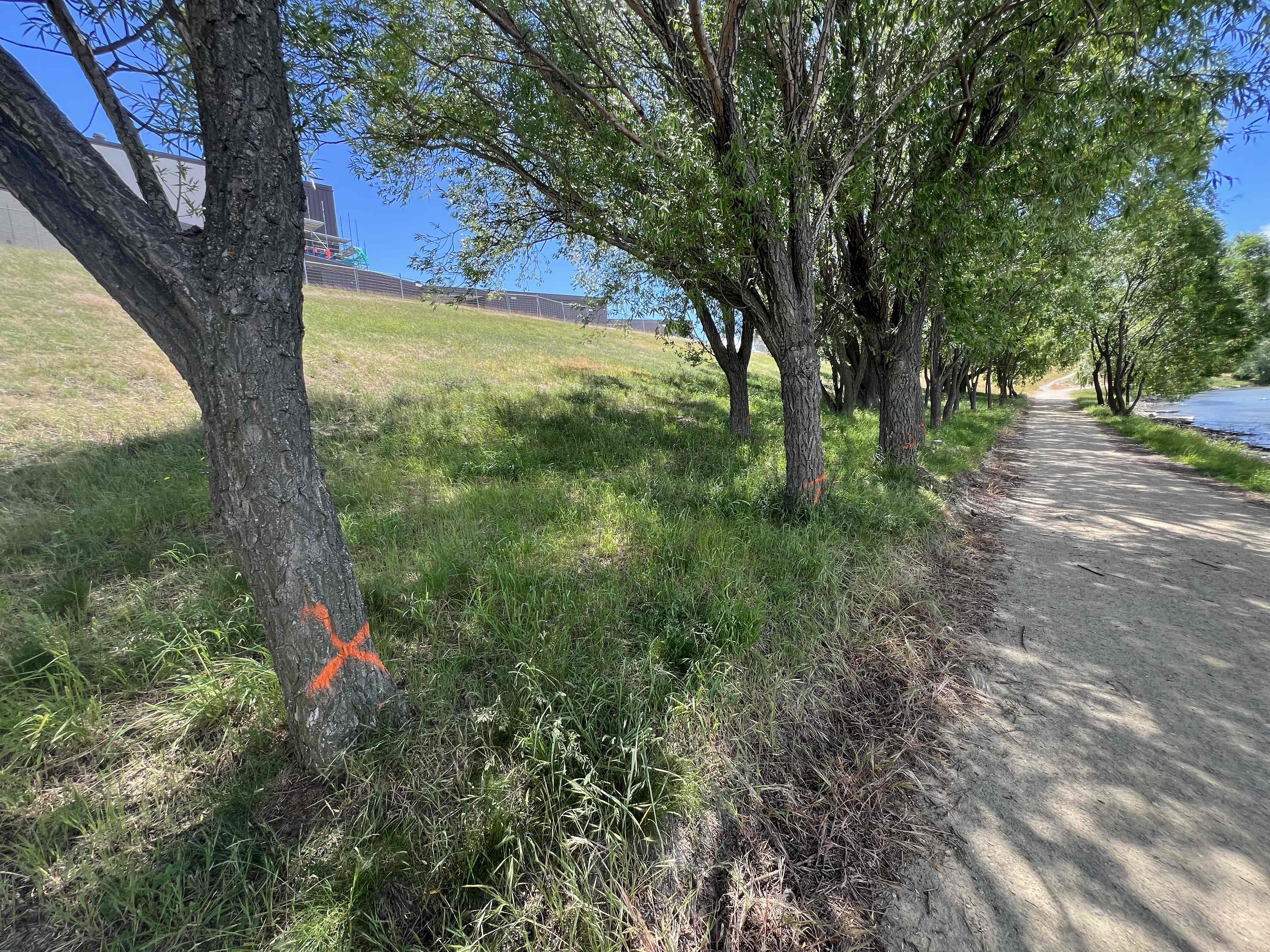 Days are numbered for dozens of trees marked with an orange ‘X’ below the new hall complex under construction in Cromwell. Image: The Central App
