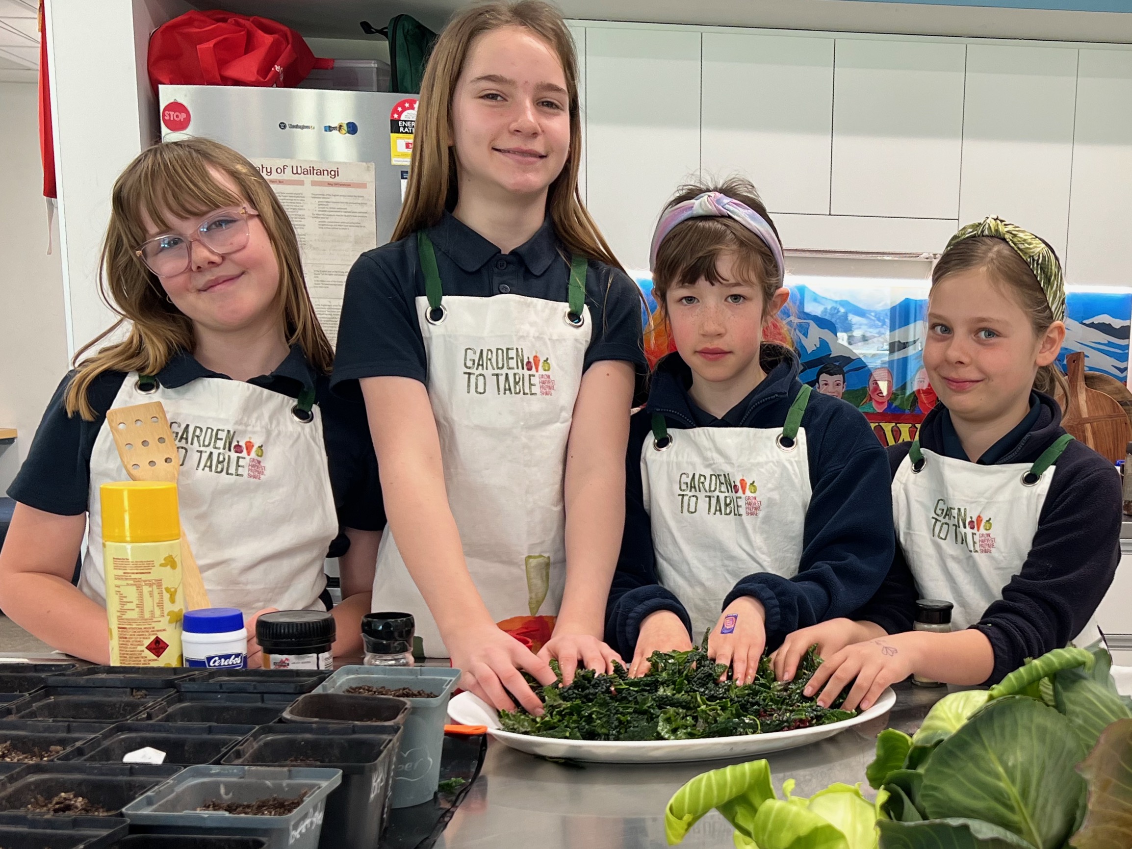 Isla Kelly, Frankie Powe, Catalina Vollweiler and Georgia Browne-Cole making kale chips in the school’s cooking classroom using produce they’ve grown.