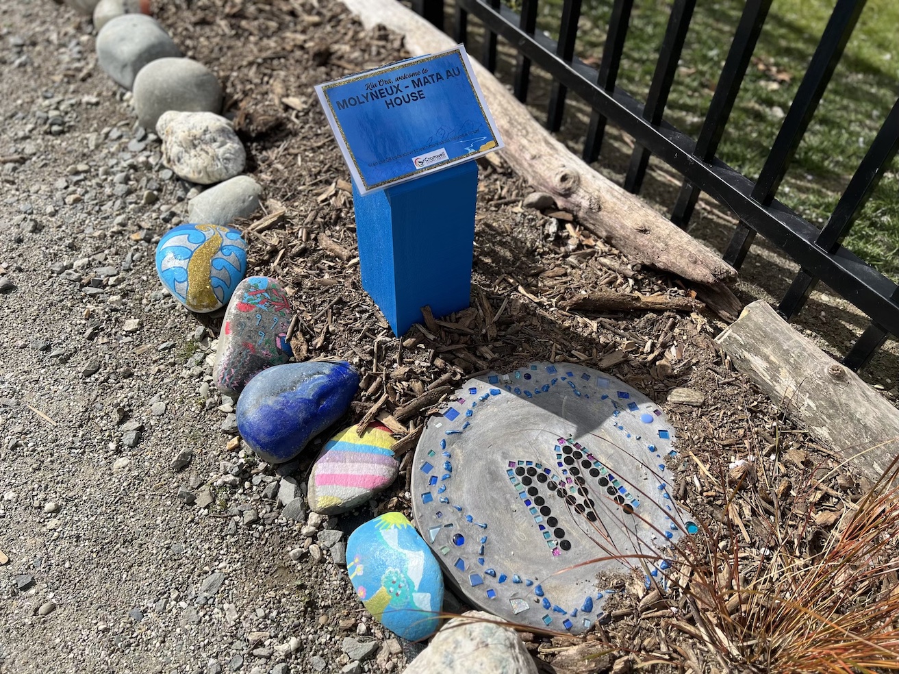 One of the brightly painted rocks in the native garden, linking the walkway to the school’s four houses.