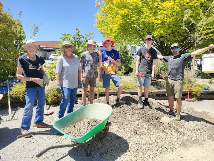 Keep Alexandra Clyde Beautiful members had some help spreading schist mulch around the plants at the Alexandra garden opposite the monument.