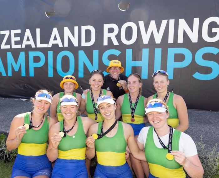 Celebrations all round for the Dunstan Arm Rowing Club squad that picked up golds, silver and bronze medals at the New Zealand Champs. Image: suppliedSixteen national rowing medals came home this week from Lake Karapiro for the Dunstan Arm Rowing Club, including four golds.