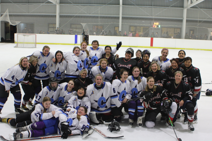 Some of the Flames women ice hockey players together with travelling team Canadian Moose last August. PHOTO: Supplied