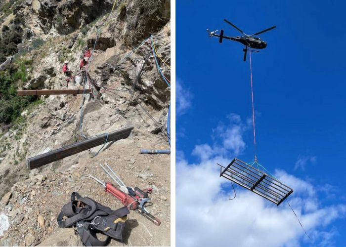 Specialist climbing gear and helicopters have opened access to challenging construction sites along the gorge. Images: Supplied/Geoff Ellis