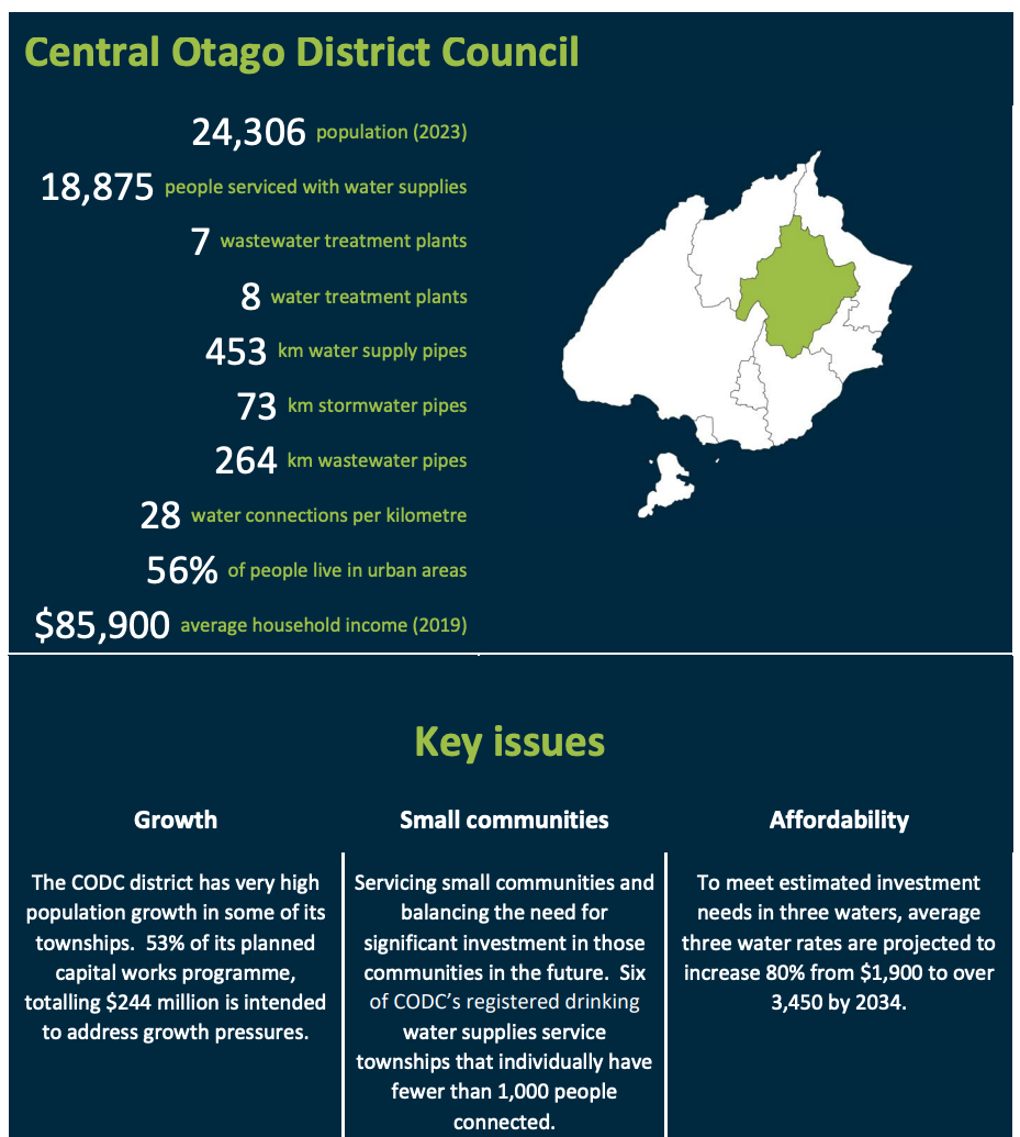 Central Otago District Council’s (CODC) initial draft 2024 Long Term Plan (LTP) forecast an increase in total three waters related borrowings from approximately $55million in 2024 to about $297million in 2034.