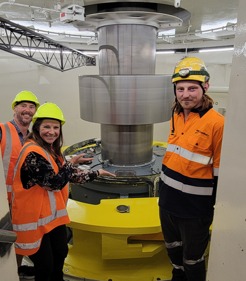 MB Century trades assistant Logan Hay (right) shows off the newly refurbished turbine assembly which is now back online, generating electricity for Contact at the Roxburgh Hydro Station. With him are MTFJ Coordinator Craig Gilchrist and Central Otago Mayor Tamah Alley.