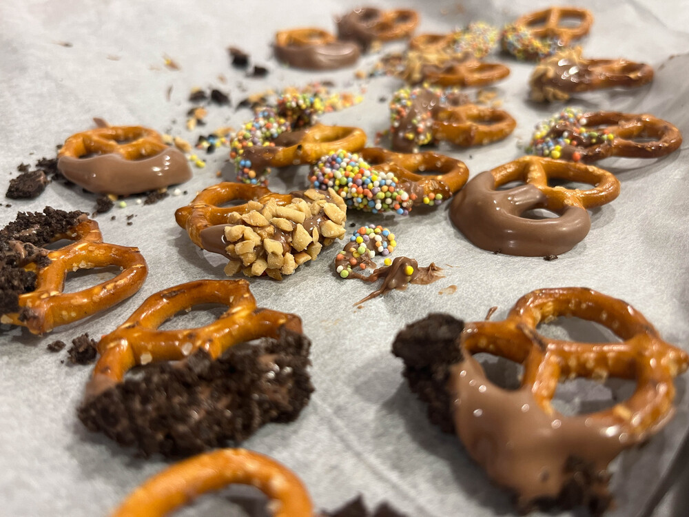 Chocolate dipped pretzels are a Christmas tradition.