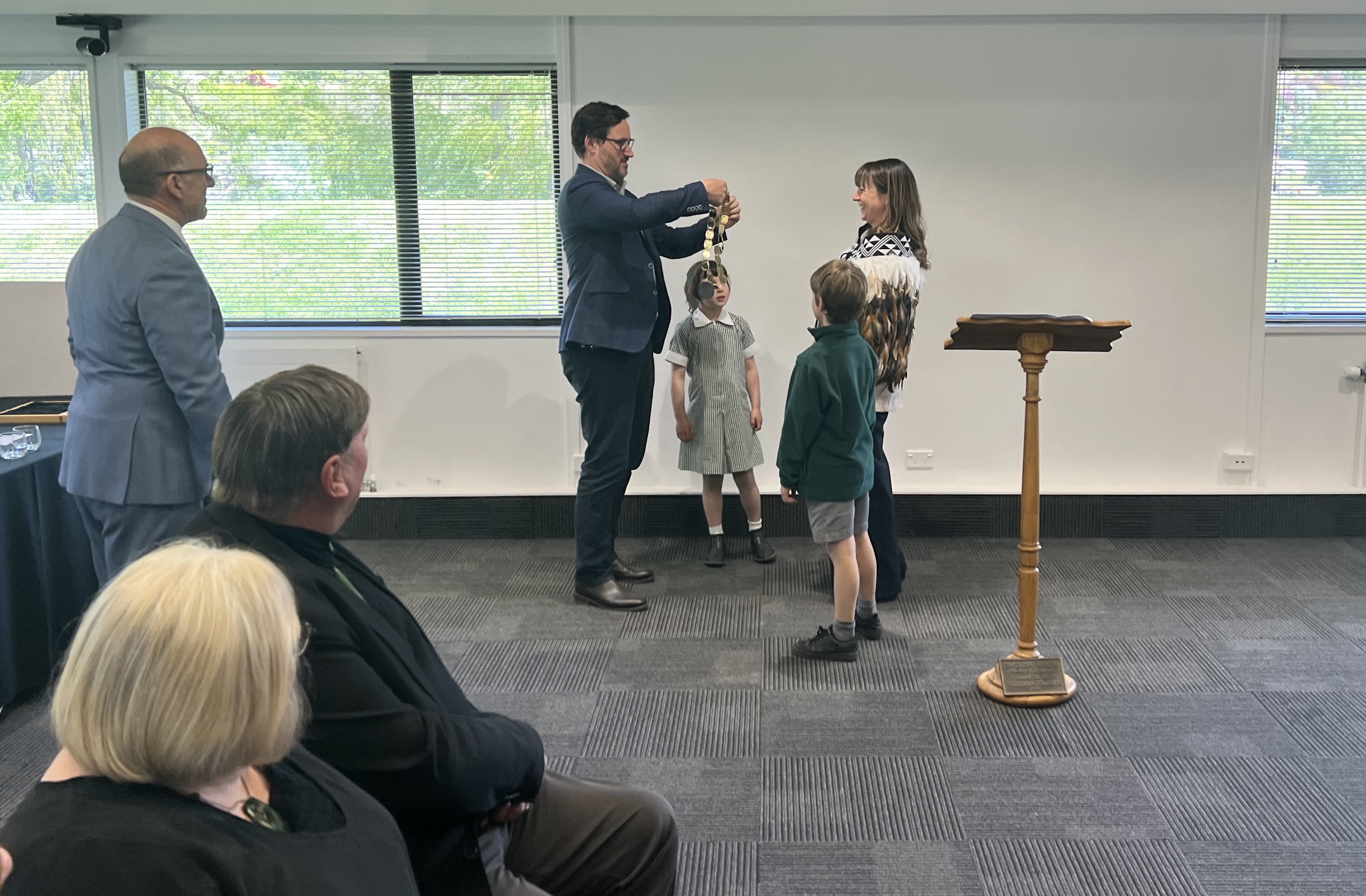 Mayor Tamah Alley is presented with the mayoral chains by her husband Matthew at the first meeting. Image: The Central App