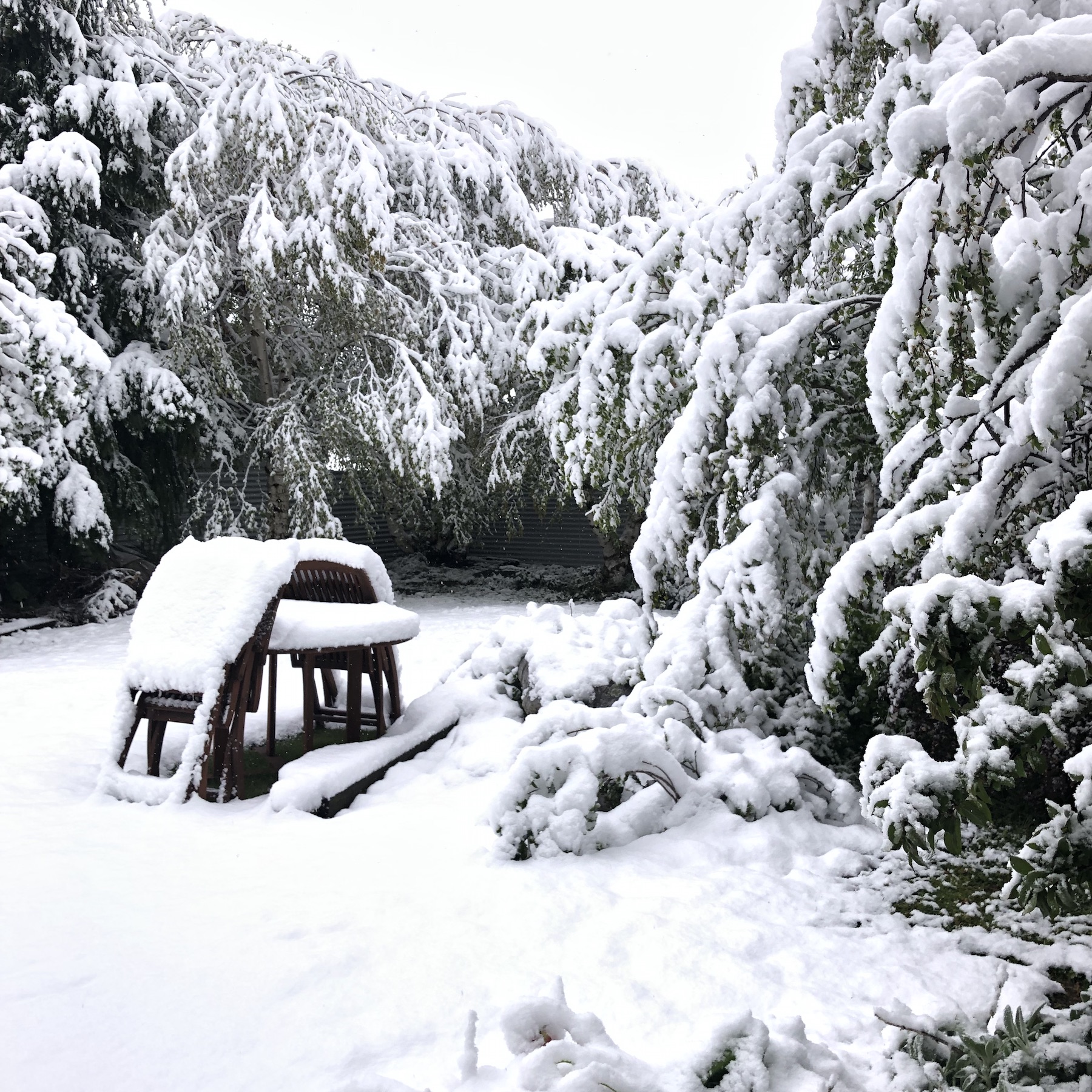Oturehua at 7.30am – Heavy snowfall this morning weighed down trees
