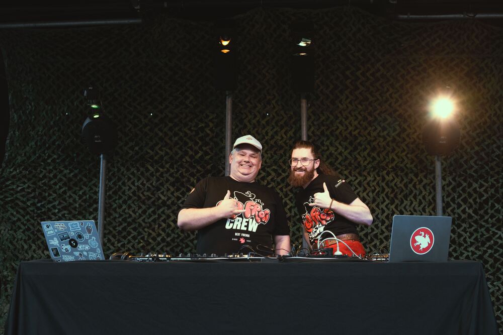 Red Frogs national director Ray Thomson (left) with DJ Trent Newton, of Brisbane, on the Red Frogs stage on New Years Eve in Wanaka. PHOTO: Red Frogs NZ