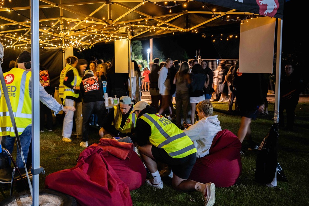 Red Frogs volunteers supporting young people at the Chill Out Zone at Dinosaur Park in Wanaka on December 30. The park was the site of a mass disturbance on the night of January 1. PHOTO: Red Frogs NZ