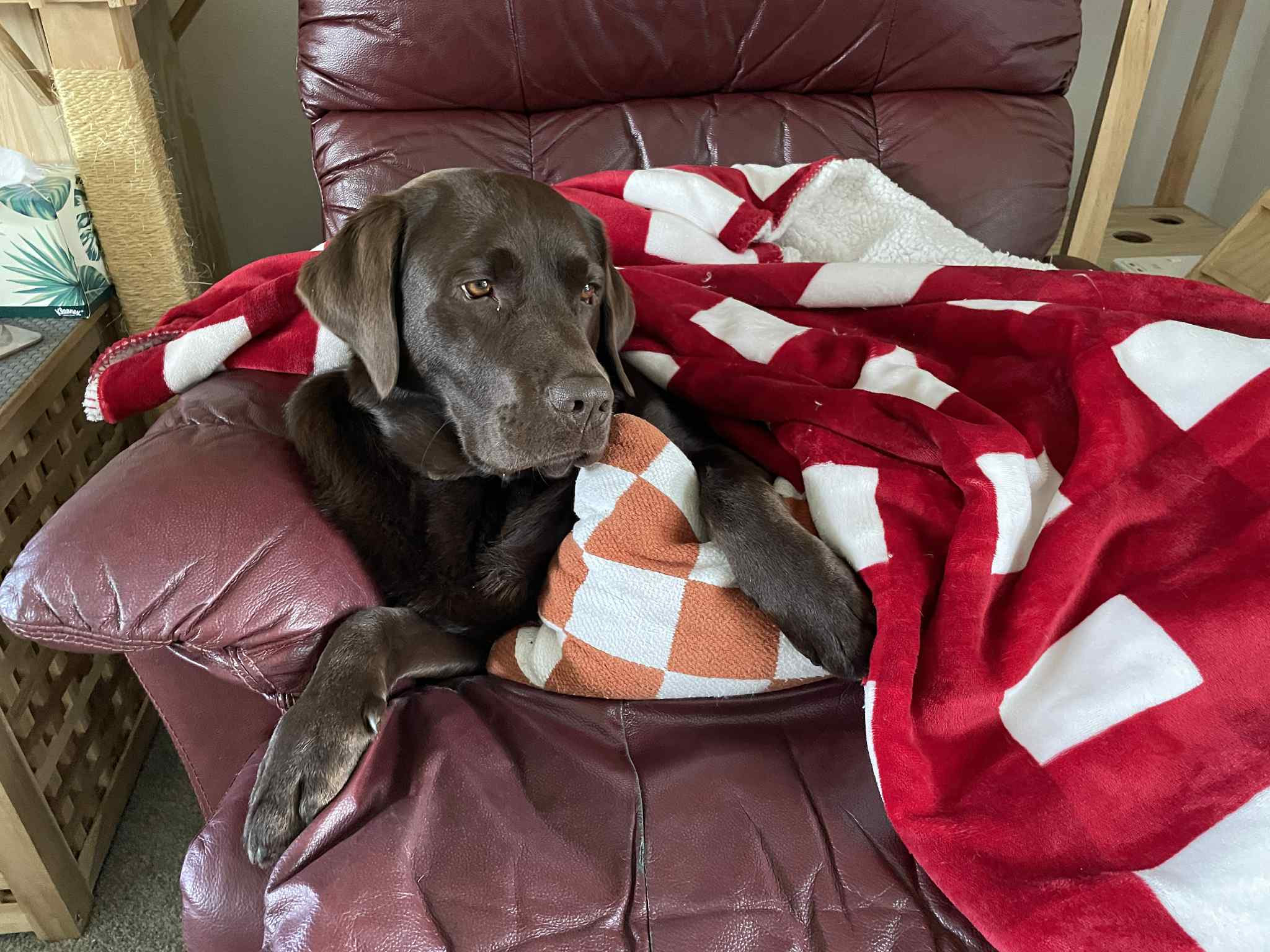 Chocolate Labrador Toffee is recovering after she ‘wolfed’ down pindone-laced carrots during an evening walk in Alexandra on Friday. Photo: SuppliedA dog owner says her beloved pet is alive thanks to the quick thinking of her husband after the animal ate carrot pieces laced with poison while on a walk in Alexandra on Friday (July 11).